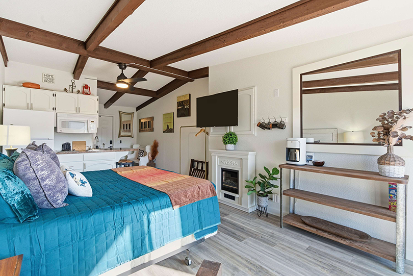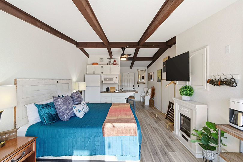 This studio unit comfortably sleeps 2 guests with a king size bed, a smart TV, and an ensuite bathroom with a single vanity and a walk-in shower.