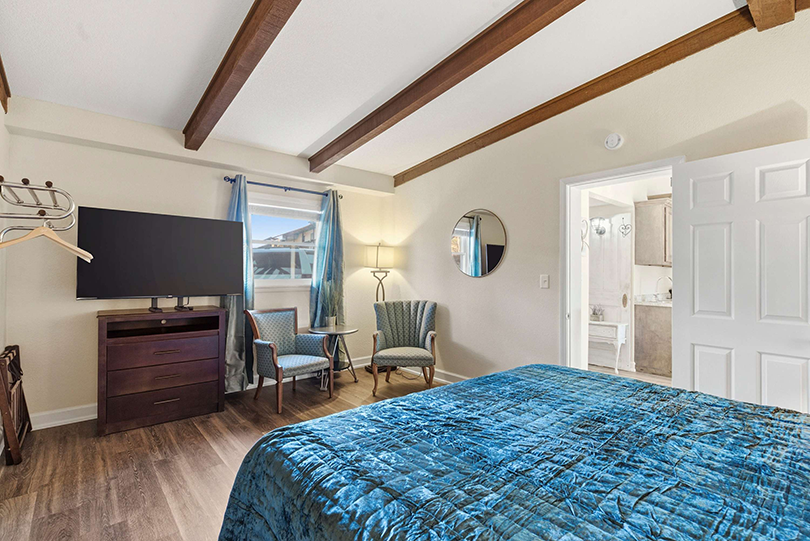 The bedroom includes a king size bed and a smart TV.