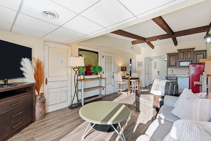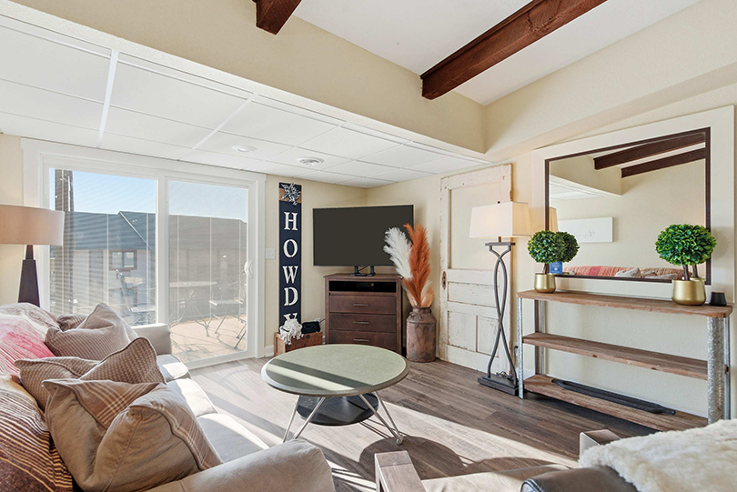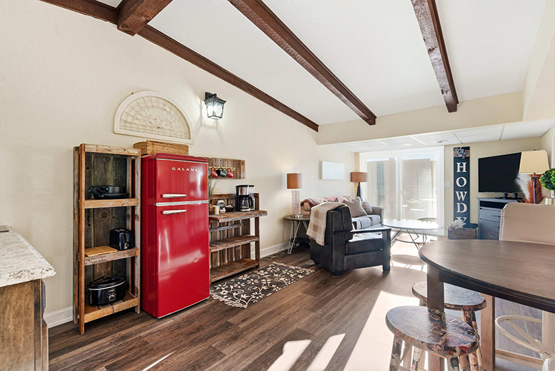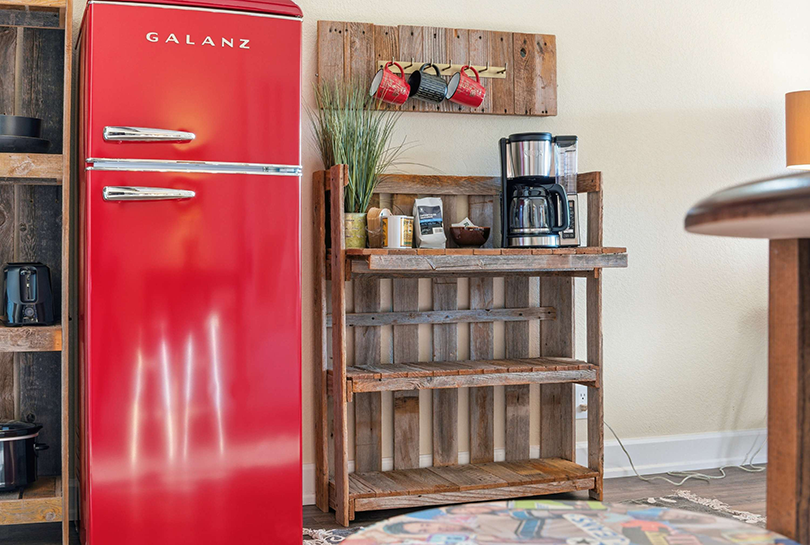 Step inside and feel instantly at ease. The bright kitchenette features a vintage red fridge, a convenient coffee station, and a table for four—perfect for relaxed breakfasts before heading out on the lake. In the living room, a comfy couch and armchair sit across from the smart TV, creating a welcoming spot for movie nights or winding down after a day outdoors. Slide the doors open and step onto your private deck, where a table for two invites you to enjoy al fresco meals with calming water views that make every moment feel like a true getaway.